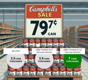 Customers who saw no reference to any limit purchased (on average) 3.3 cans of soup while customers who saw a limit of 4 bought 3.5 cans of soup. Where it gets really interesting is the third condition. The limit of 12 signage increased sales per buyer by 112% compared to the no limit per — from 3.3 cans per buyer to 7.0 cans per buyer.