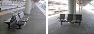 So what solution did they implement? They simply turned the benches by 90 degrees so that they were not facing the trains. See below left for the conventional platform seating and below right for the newly reoriented seating.
